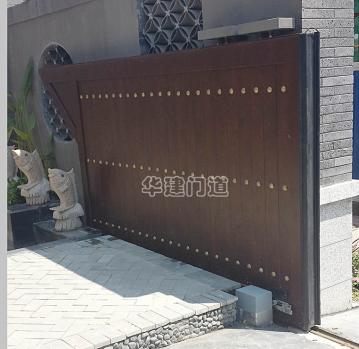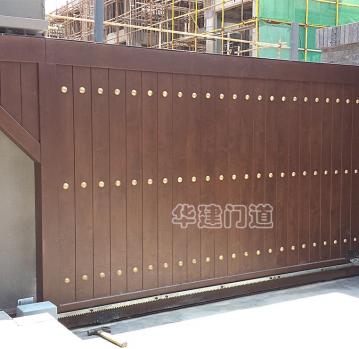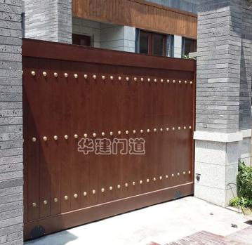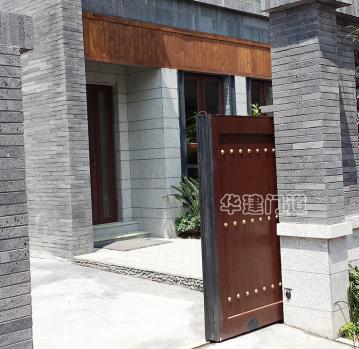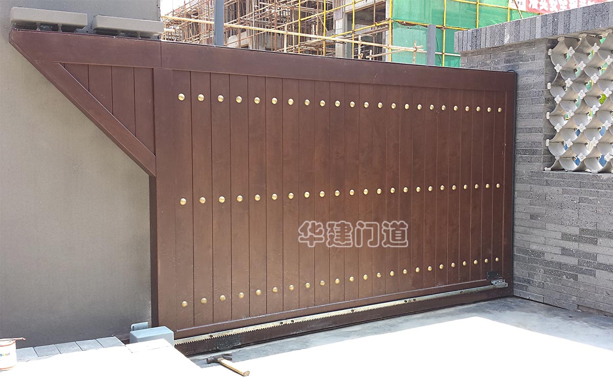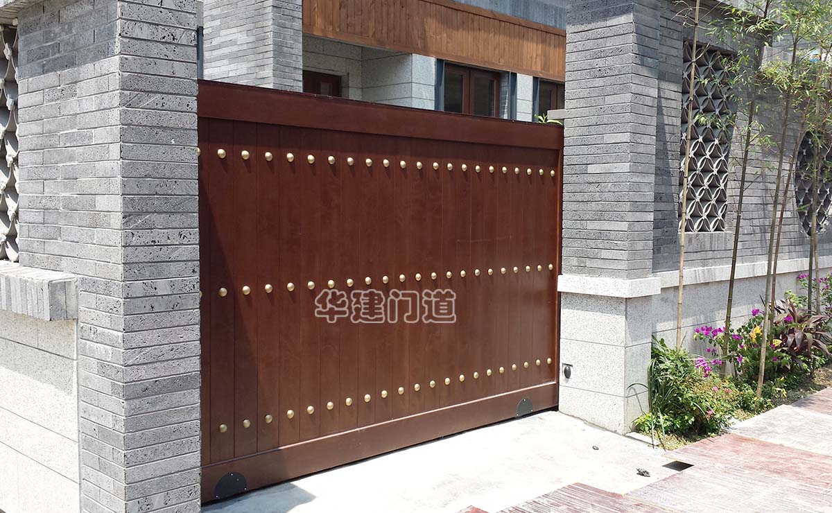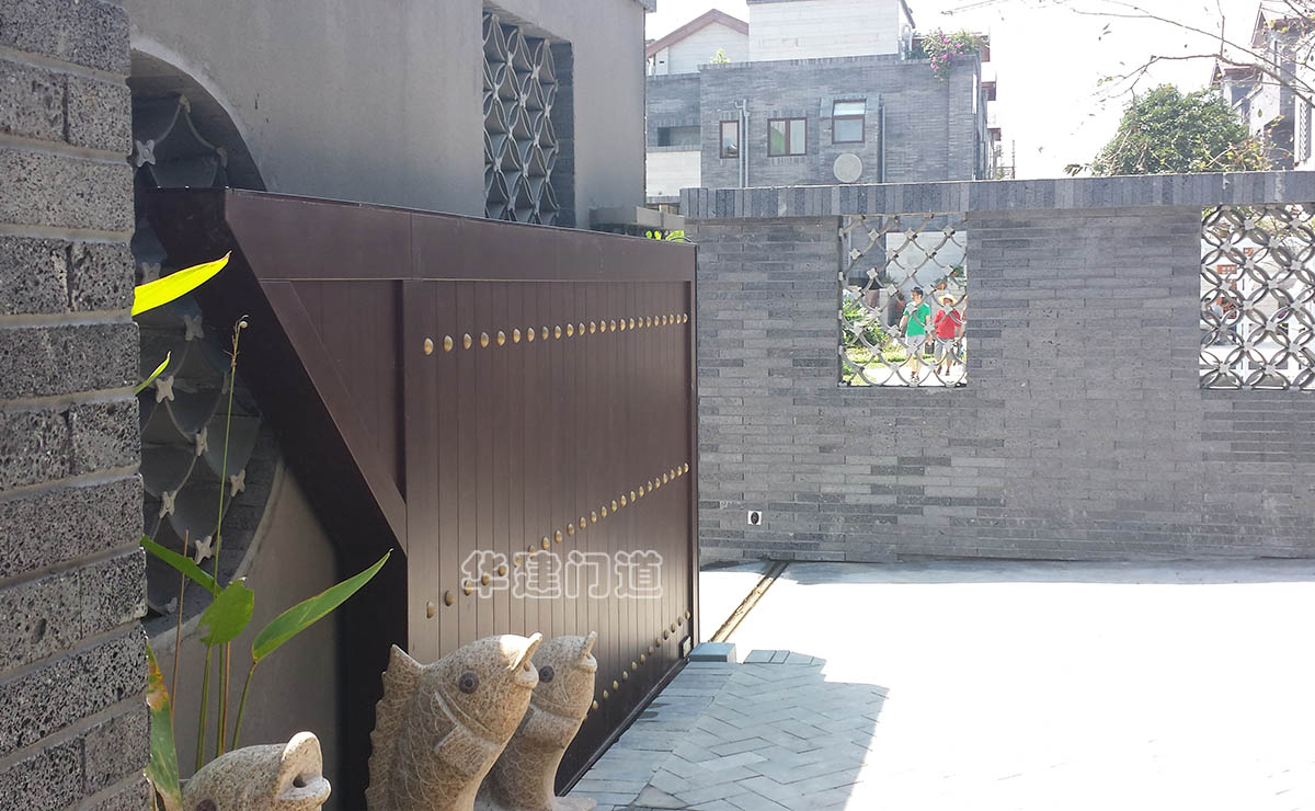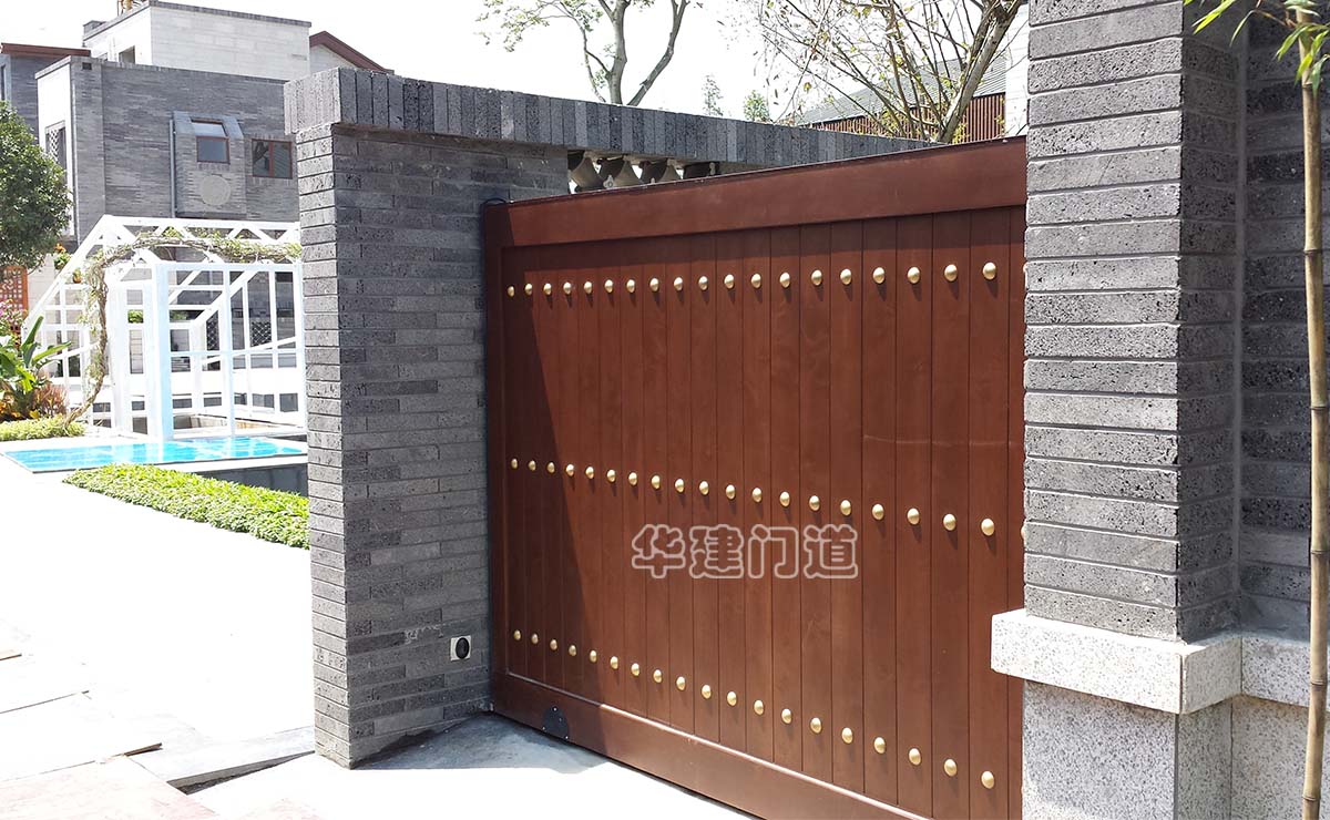 青城鑒山別墅項目采用我司高端實木遙控庭院門;門體采用鋼骨架,外覆實木木板,總厚140㎜;門體底部設承重輪,頂部設不銹鋼導向槽和溢流管(引流雨水);門體正反面均鋪設進口榿木木板,與圍墻重疊部分采用鋼材做懸挑支撐;門體木板采用凹凸楔口拼合,外不露釘,設有邊框和銅質炮釘;門體油漆采用進口室外環保油漆;驅動電機采用平移開門機,運行平均速度控制在10cm/s-20cm/s之間;停電可手動開關門,電動時可通過控制盒或遙控器作開、停、關操作;在門體前端設有雙氣囊結構的安全氣囊保護裝置,當門體運行過程中遇有障礙物阻擋將自動停止運行;門洞兩側設有紅外線保護裝置,在門體運行過程中有障礙物穿越,門體將自動停止運行;在實際使用中運行輕便自如,高雅美觀、宏偉大氣,得到客戶及用戶的一致好評!