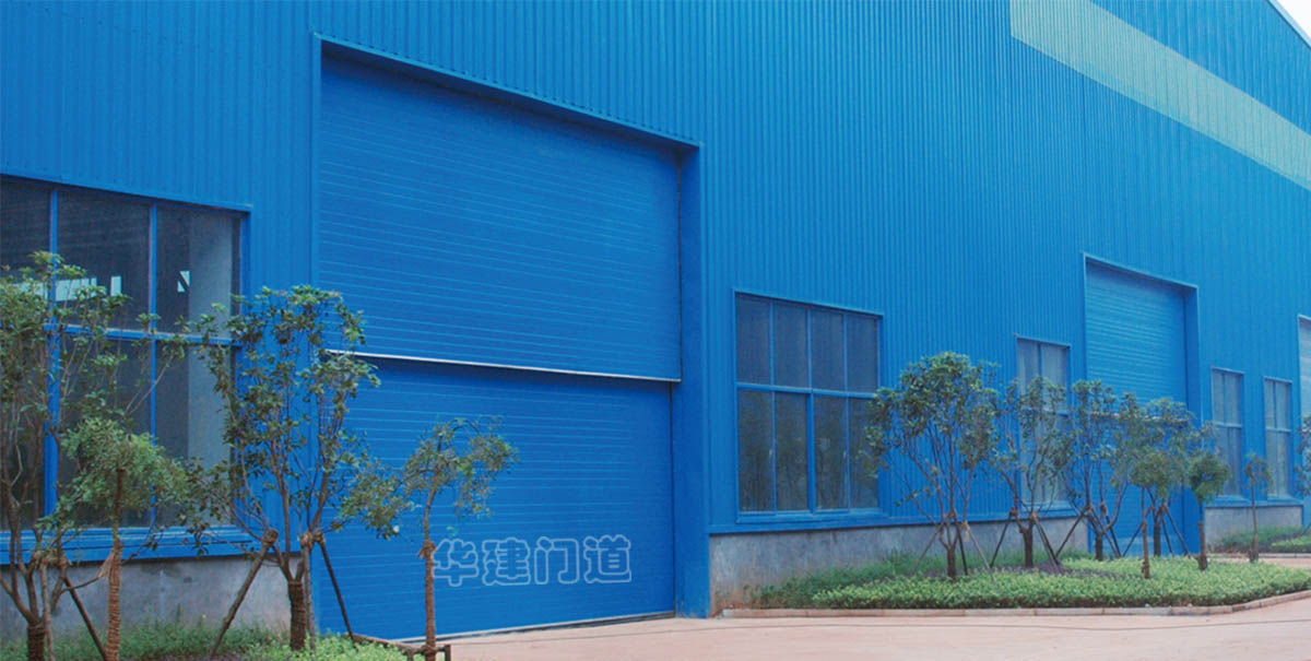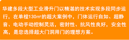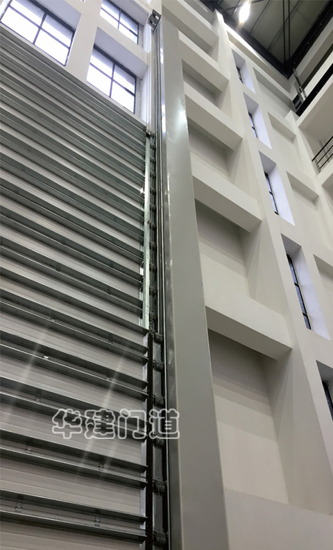 華建工業(yè)多段滑升門是滑升門中的大型滑升門,通過在門洞兩邊立柱上安裝鋼結(jié)構(gòu)桁架,在桁架上安裝門體軌道,軌道中配置滑輪軸承與門體相連,通過特制的各導向滑輪、頂部滑輪平臺系統(tǒng)、傳動鋼繩、配重平衡裝置等系統(tǒng)的設(shè)計,最終將門體重量合理的分配到墻面和地面上;通過多段分層的提升方式把門體的運行行程縮短,降低了對安裝空間的要求,采用特殊的配重平衡系統(tǒng)克服了常規(guī)滑升門的平衡問題;設(shè)計結(jié)構(gòu)巧妙合理,穩(wěn)定性高,可實現(xiàn)單樘門上百平方米的超大面積。