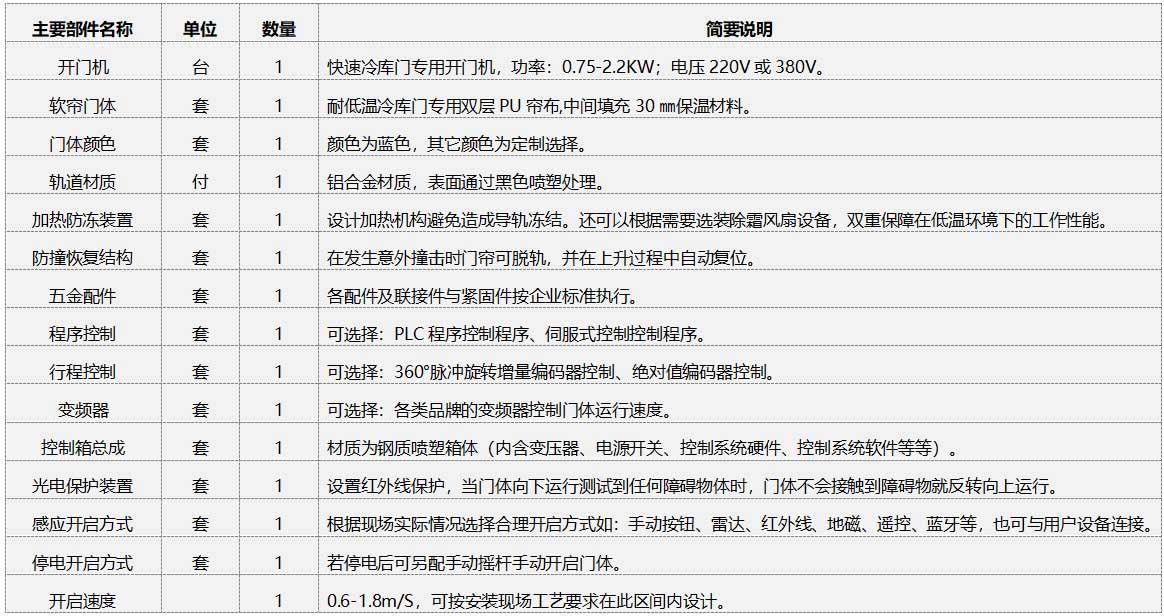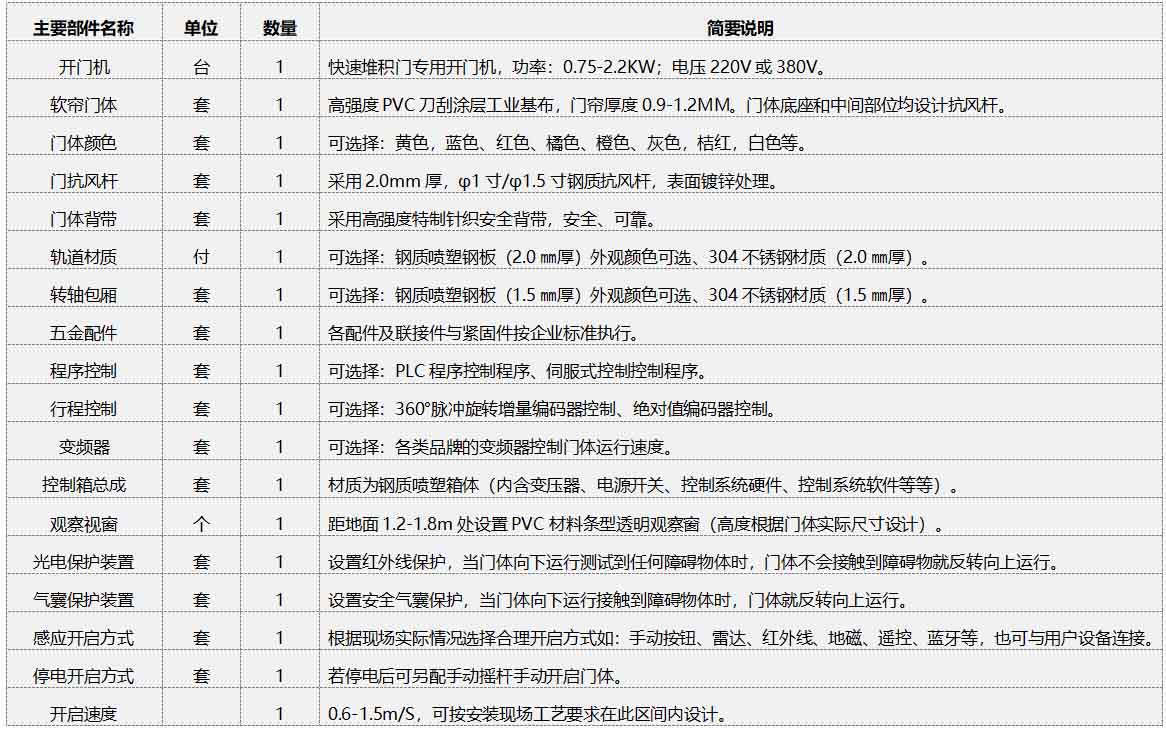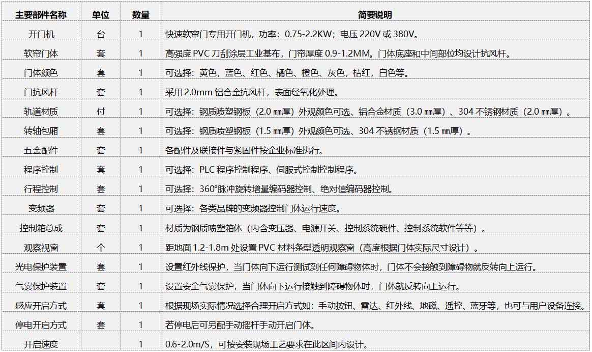 快速軟簾門部件清單(單樘)及簡述