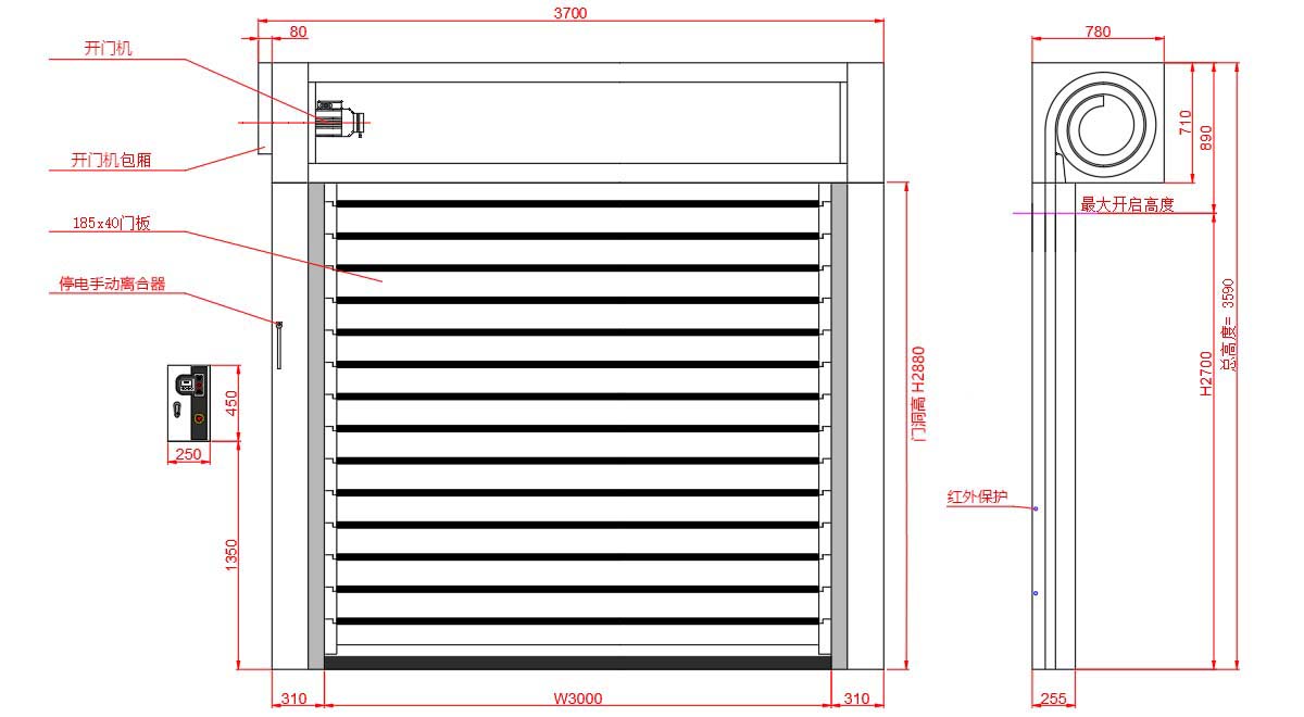 快速硬質(zhì)門的安裝土建結(jié)構(gòu)要求相對(duì)簡單,根據(jù)產(chǎn)品各處尺寸及實(shí)際安裝工藝方法確定快速硬質(zhì)門安裝對(duì)土建結(jié)構(gòu)尺寸的要求為:門洞兩側(cè)寬度空間≥310㎜(但應(yīng)有安裝控制器的位置)、安裝電機(jī)處寬度空間≥390㎜、安裝卷軸處高度空間≥650-1000㎜(實(shí)際尺寸根據(jù)門洞高度調(diào)整)。