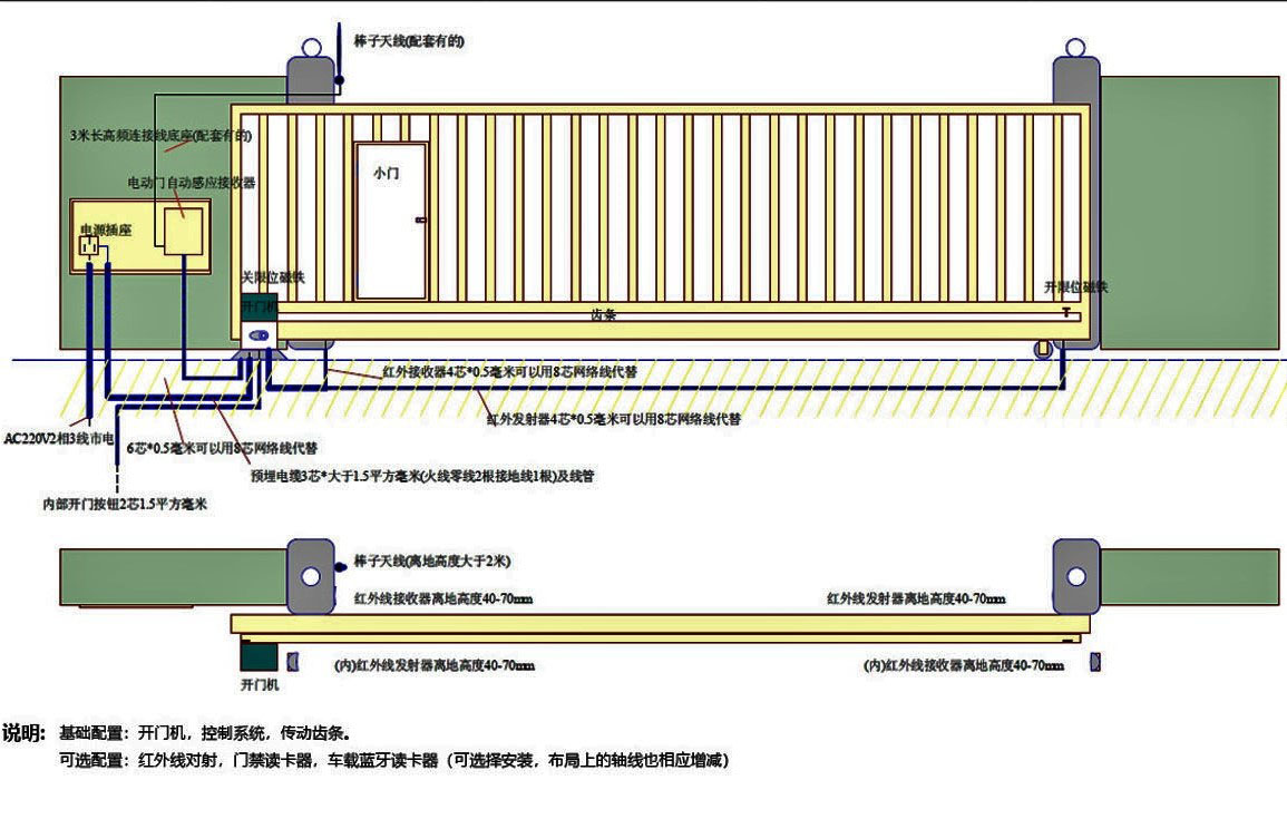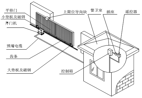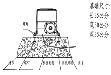 安裝前在地面預埋設輕軌,軌道長度為大門長度的兩倍。門的軌道應保證平直,在門的軌道兩端頭安裝機械限位塊。從電控箱所在地至主機附近需埋設電線管道。管道材料為硬鎧甲管、鍍鋅管或鋁塑復合管。管內徑應大于20mm。電機安裝需有牢固的基礎,各部件安裝位置及電機基礎要求如圖: