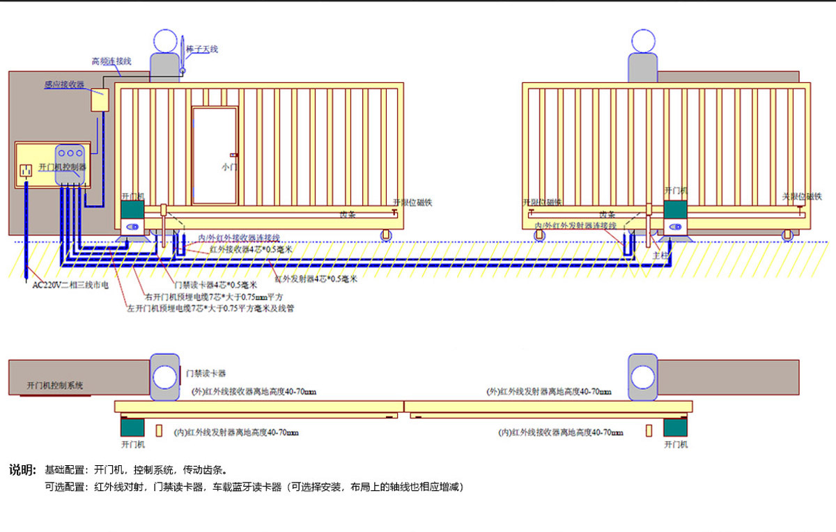 華建電動庭院門按材質分為:鋼質(鐵藝)庭院門、鋁藝庭院門、木質庭院門;按開啟方式分為:電動平移庭院門、電動平開庭院門,電動平移庭院門又分單扇平移和雙扇平移,電動平移庭院門不管門體采用什么材質、不管是單扇還是雙扇,整體的運行方式是一樣的(直線運行),開門機有:分體式平移門機(電機部分與控制部分分開,為兩個設備)、一體式平移門機(電機部分與控制部一體,為一個設備);電動平移庭院門還是以安裝分體式平移門開門機的效果最佳;這里按分體式平移機的電動平移庭院門做技術說明。